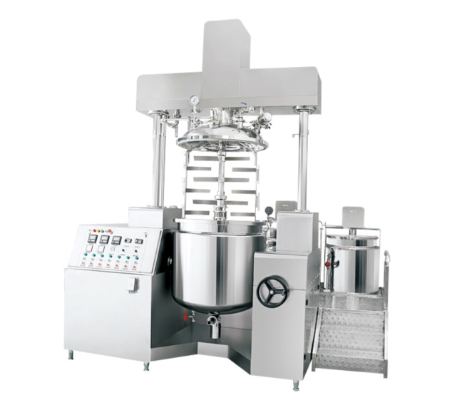 真空乳化機(jī)主要由水相鍋、油相鍋、乳化攪拌主鍋、真空系統(tǒng)、升降系統(tǒng)(可選)、電器控制系統(tǒng)(可選用PLC)、操作平臺(tái)等組成。