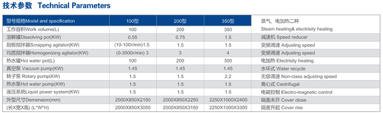 This machine adopts upper coaxial dual agitator, liquid power to lift and down to open cover, fast homogenizing agitator rotary speed: 0-1400r/min (frequency control), slow scrapping agitator rotary speed: 10-100r/min (infinite speed variation), the homogenizing head adopts high cut eddy emulsifying agitating machine, slow scrapping agitator automatic tightly oppressed to the pot bottom and pot inner surface. In the agitating process, rotary pump outer recycle the material to completely emulsify the material. Vacuum absorbing material, especially absorbing powder is adopted to avoid powder and tiny dust fly. The whole process undergoes in vacuum condition to avoid material to produce bubbles in the high speed agitating, up to sanitary standard.